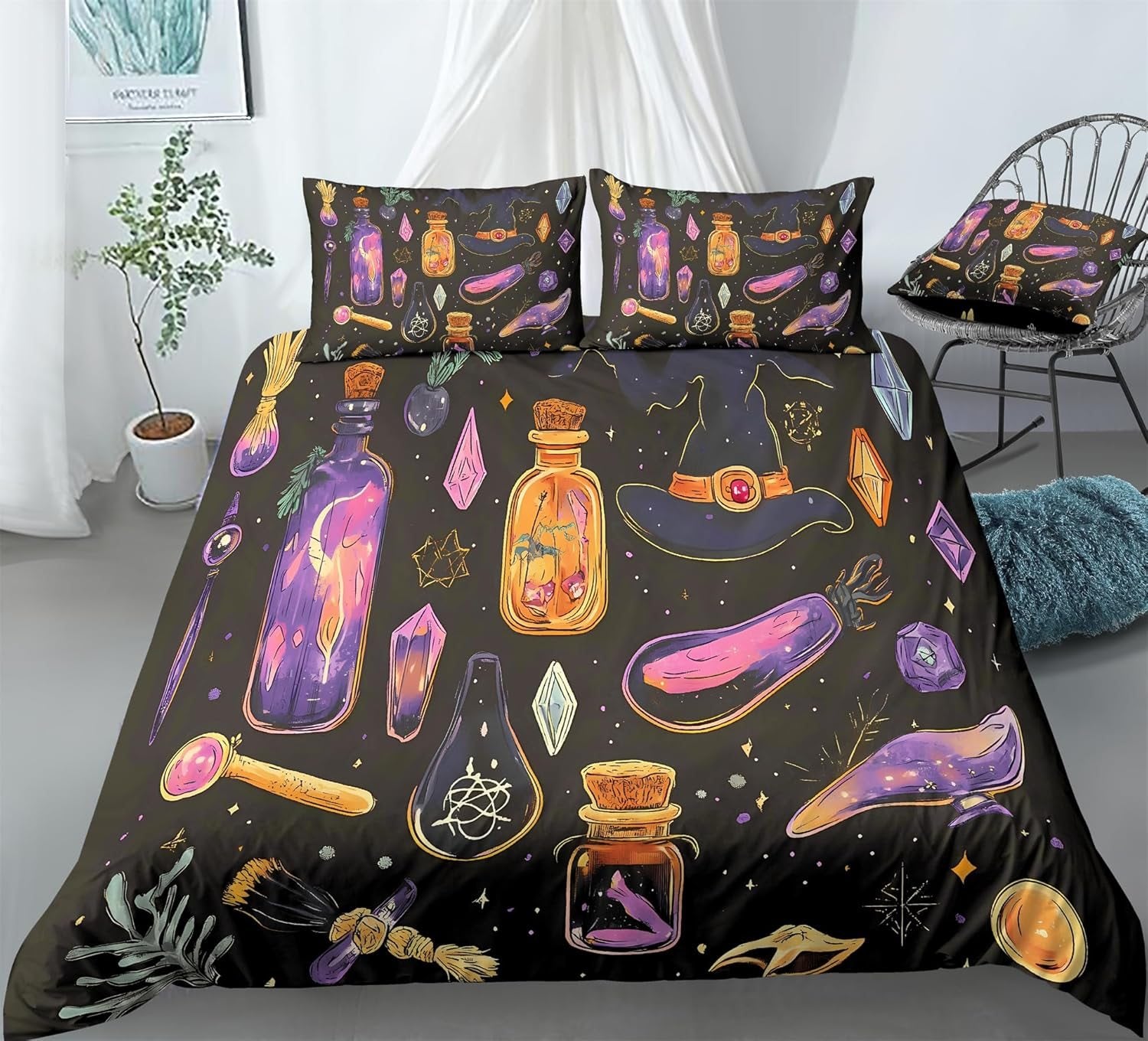 REALIN Colorful Retro Witch Print Duvet Cover Set Mystic Witch Art Bedding Girl Boy Kids Bed Sets 3/4PCS Quilt Covers/Sheets/Pillow Shams,Twin/Full/Queen/King