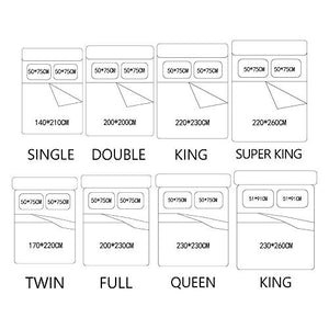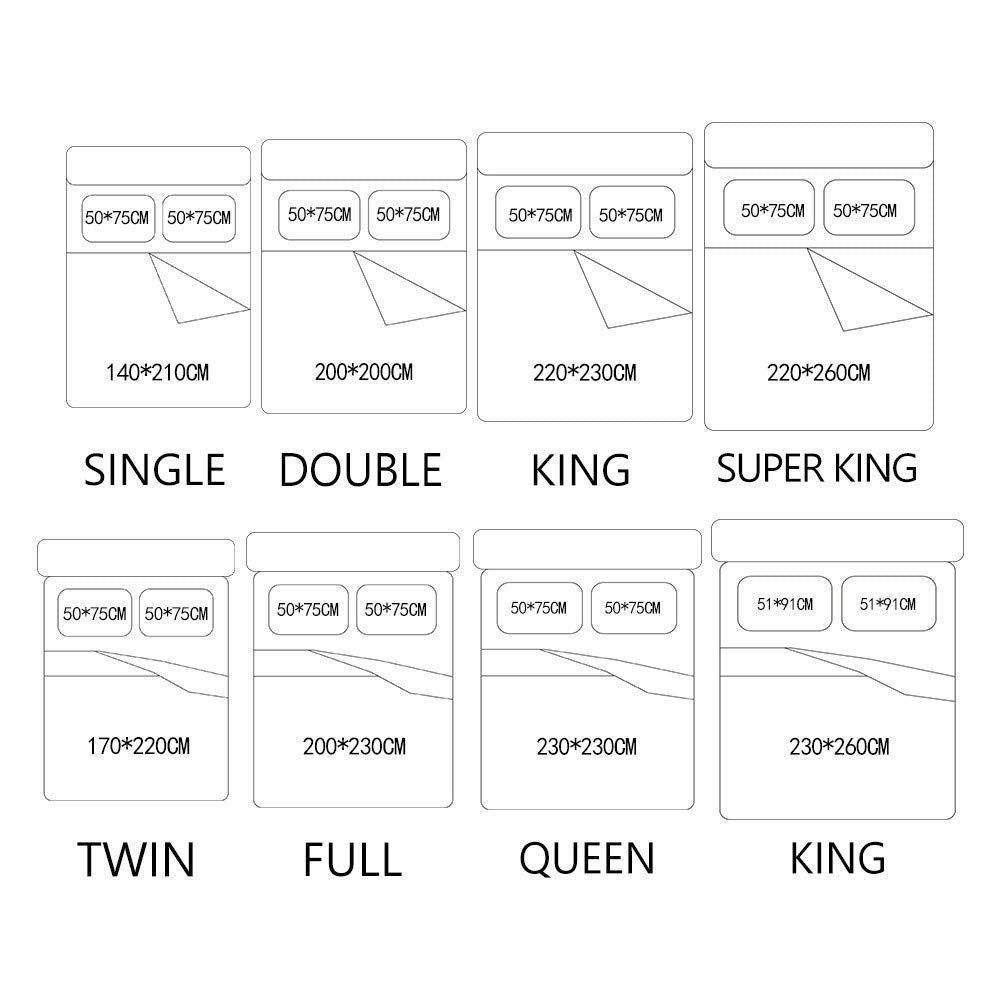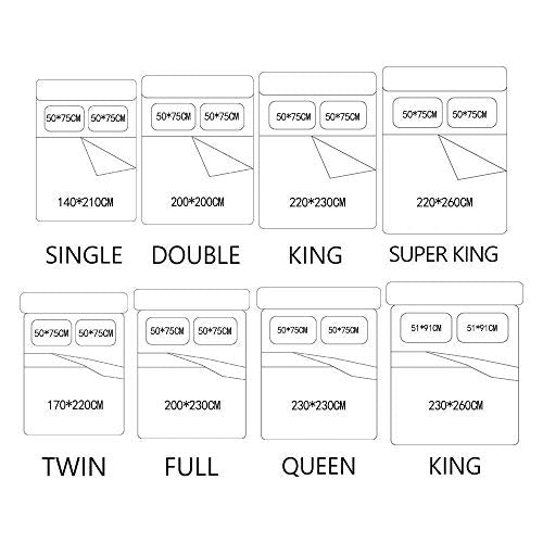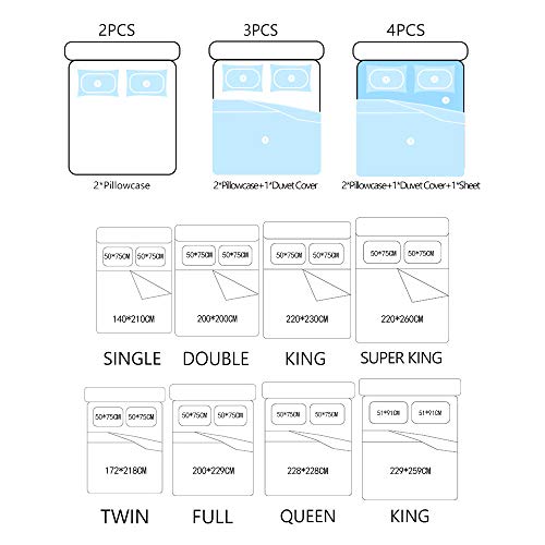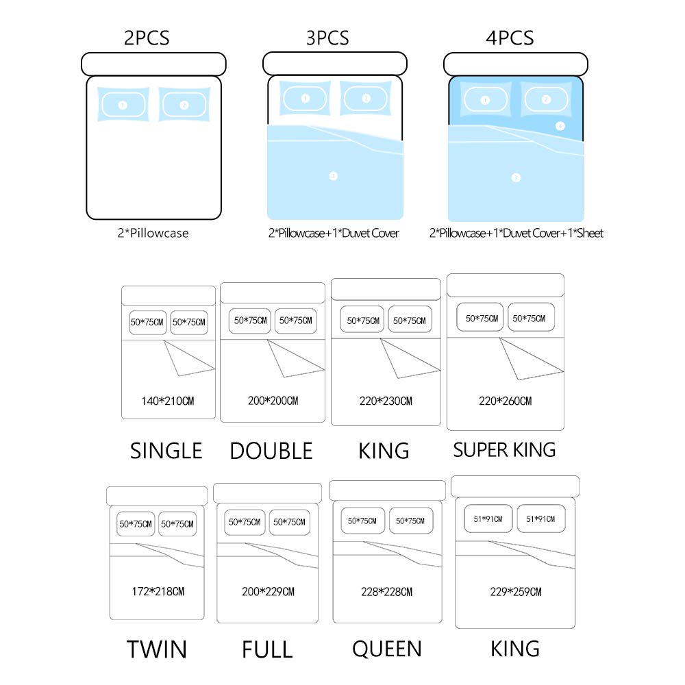 King: 1×Duvet Cover-229×259cm;1×Sheet-220×260cm;2×Pillow Shams-51×91cmcm