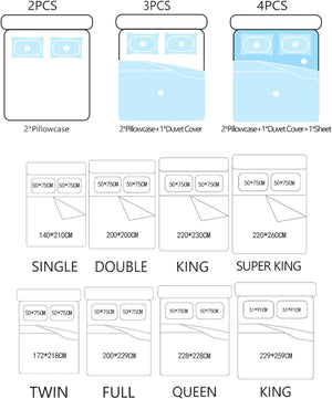 King: 1×Duvet Cover-229×259cm;1×Sheet-220×260cm;2×Pillow Shams-51×91cmcm