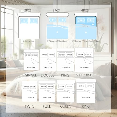 King: 1×Duvet Cover-229×259cm;1×Sheet-220×260cm;2×Pillow Shams-51×91cmcm